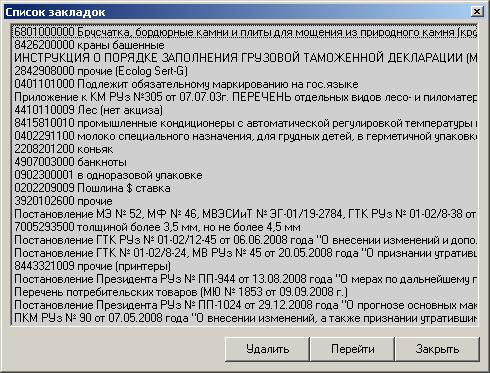 Окно списка закладок программы "СПРАВОЧНИК УЧАСТНИКА ВЭД"